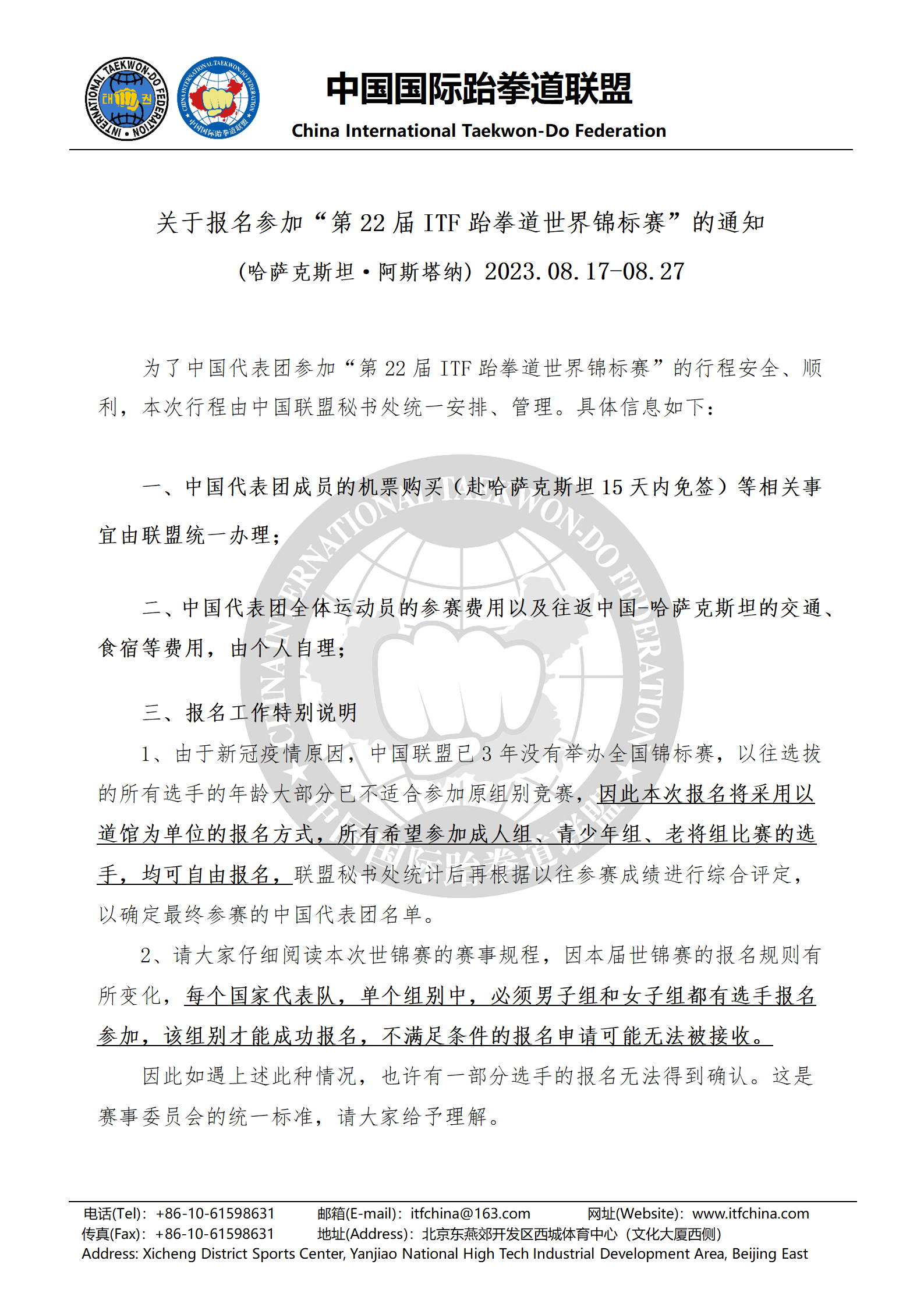 您的位置: 首页 >> 资讯中心 >> 赛事资讯>> 关于报名参加“第22届ITF跆拳道世界锦标赛”的通知