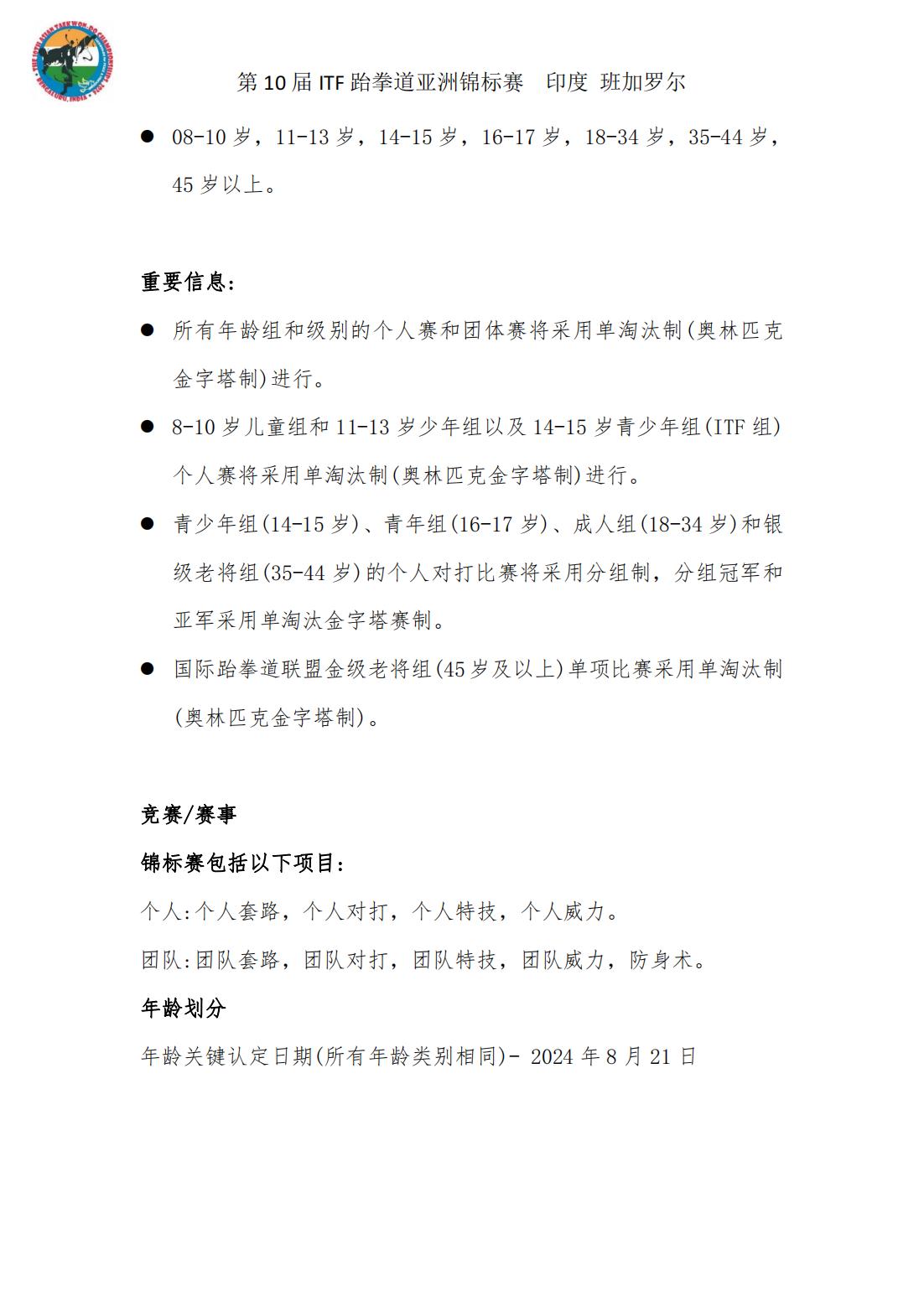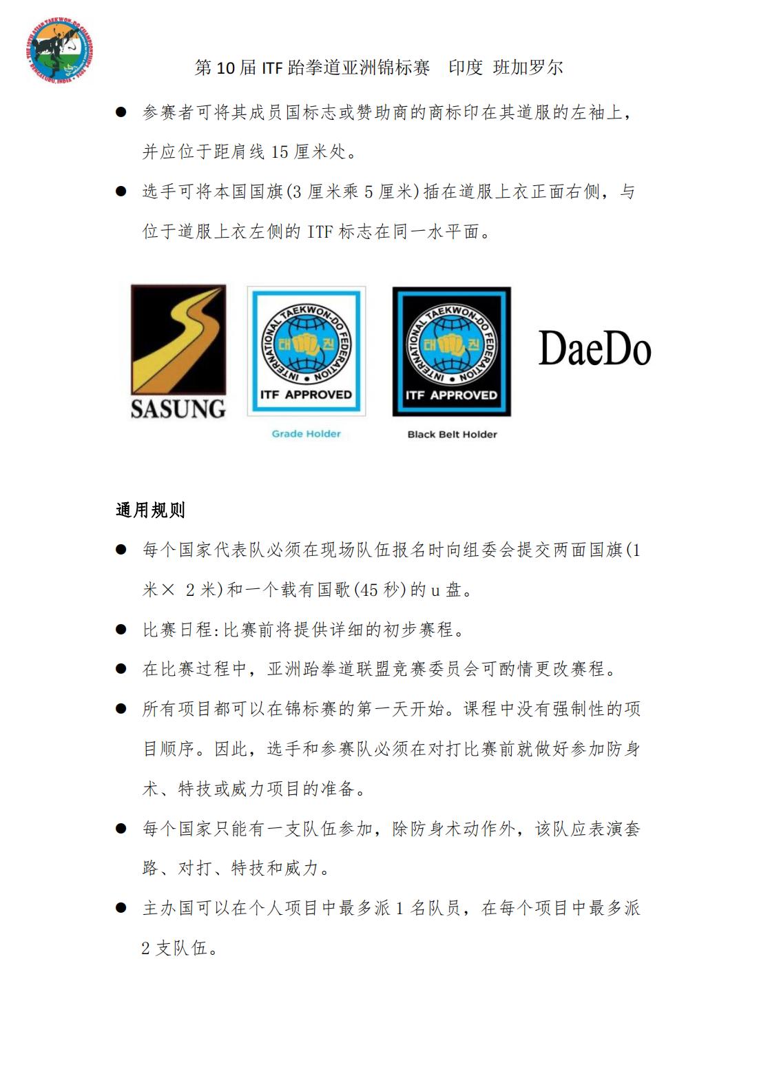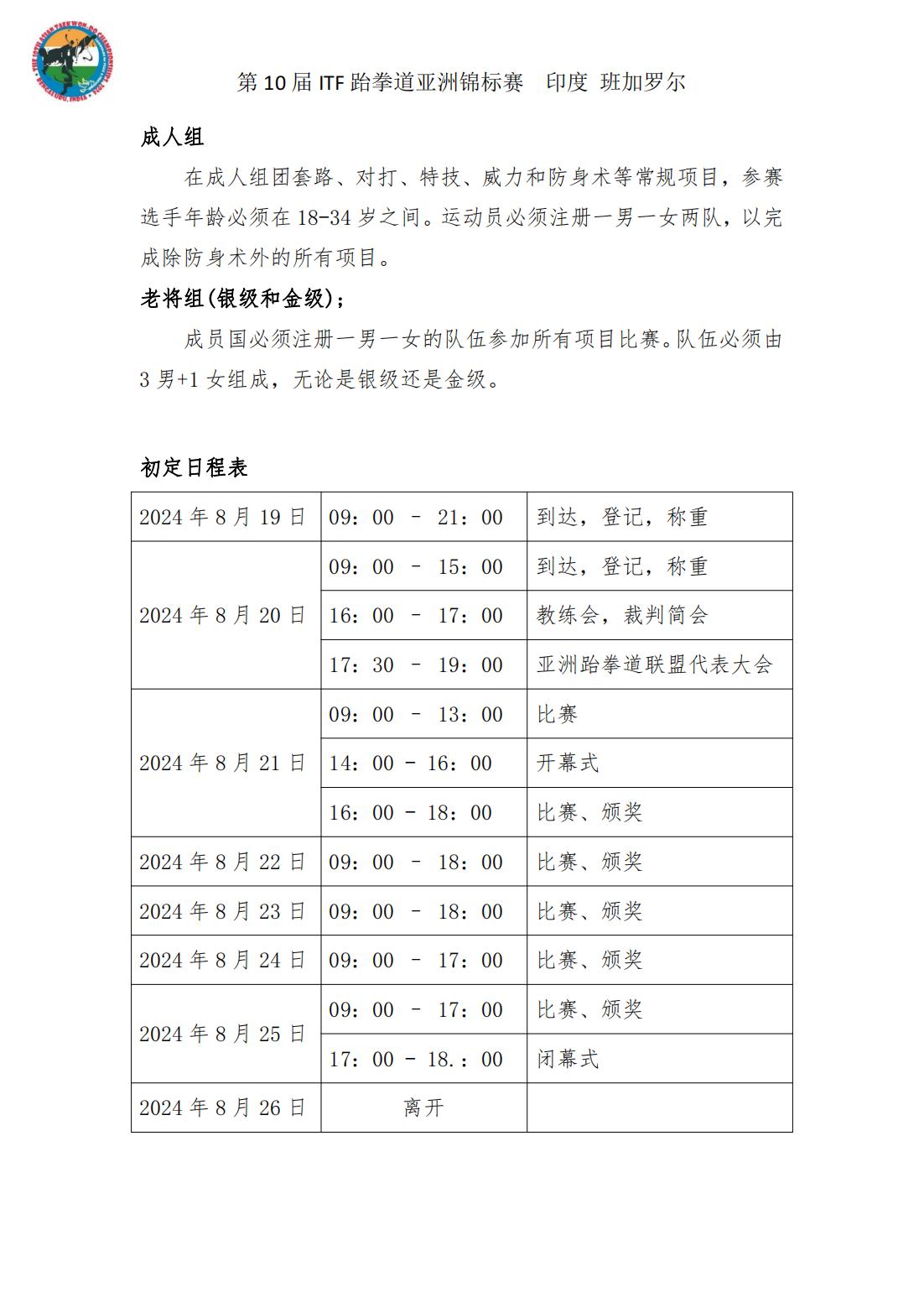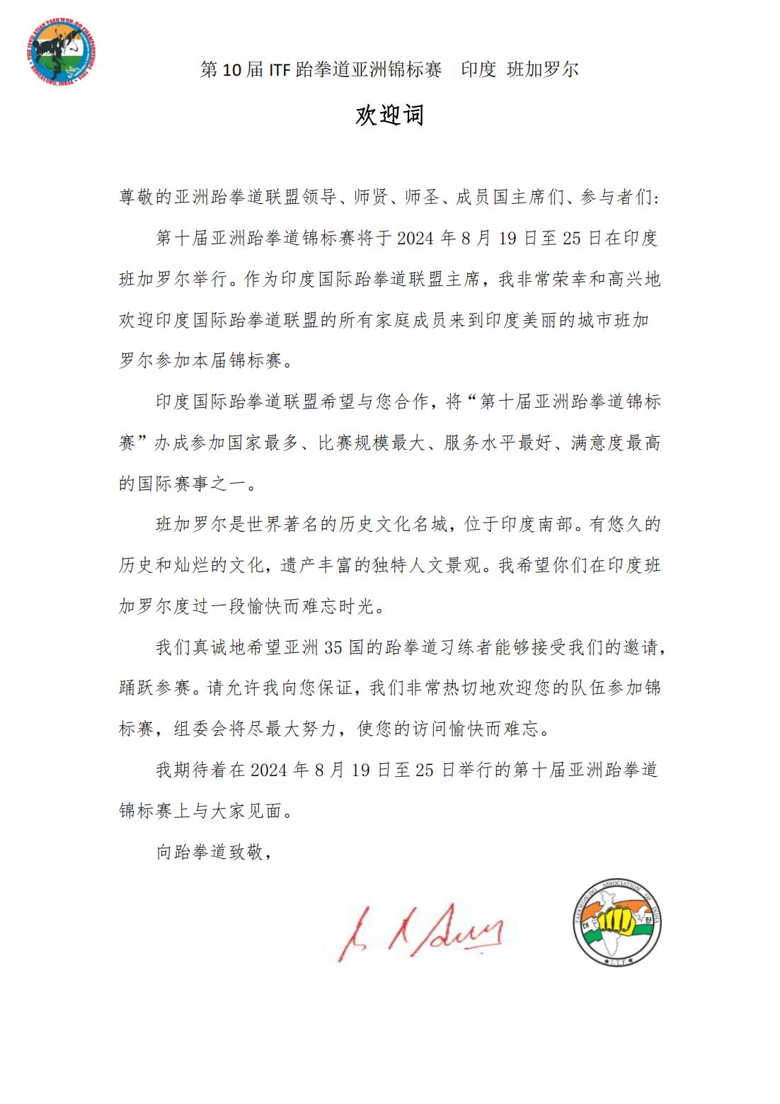 您的位置: 首页 >> 资讯中心 >> 赛事资讯>> 第10届亚洲ITF跆拳道锦标赛 2024年8月19日-25日 印度 班加罗尔