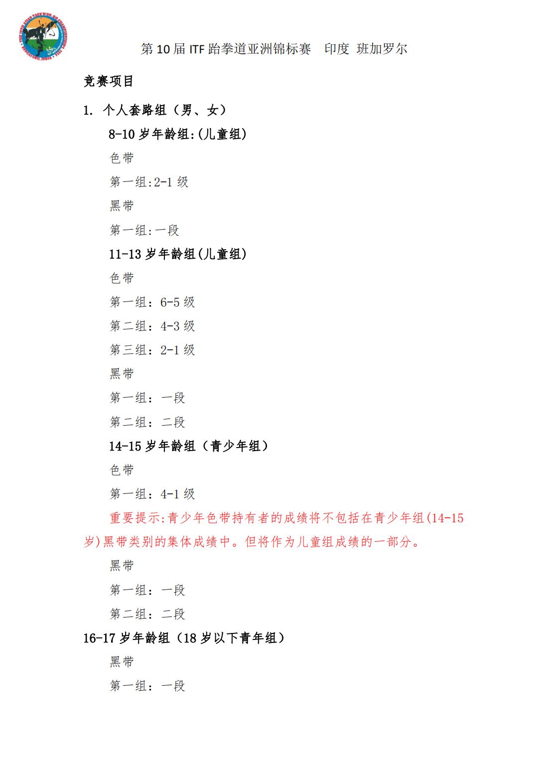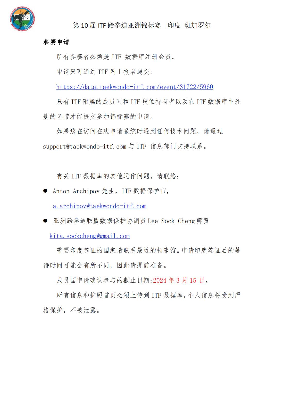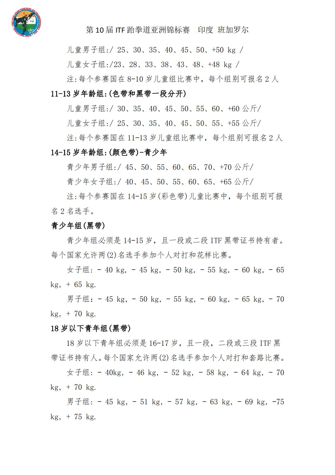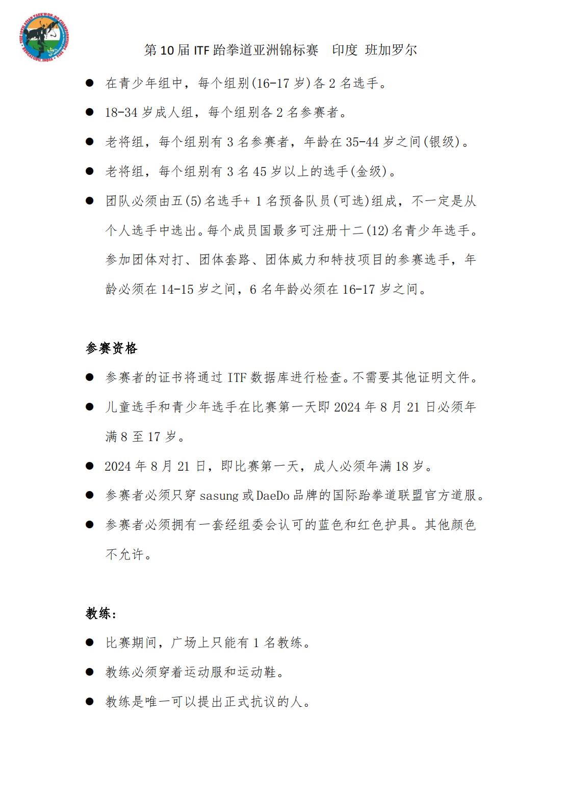 您的位置: 首页 >> 资讯中心 >> 赛事资讯>> 第10届亚洲ITF跆拳道锦标赛 2024年8月19日-25日 印度 班加罗尔