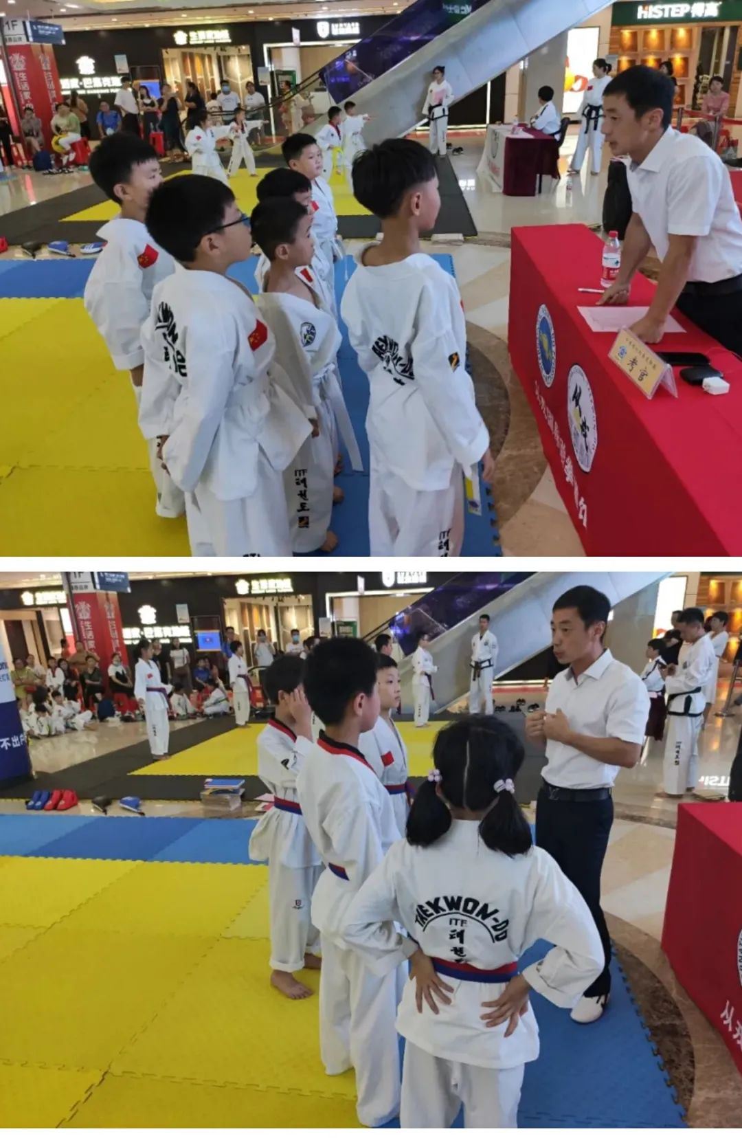 此次升级考试分为两块场地同时进行。从戎跆拳道教练团队按照考级名单和各个色带级别不同通过合理分组,巧妙搭配,各个教练之间合理分配,相互配合,减少了孩子和家长们的等待时间。