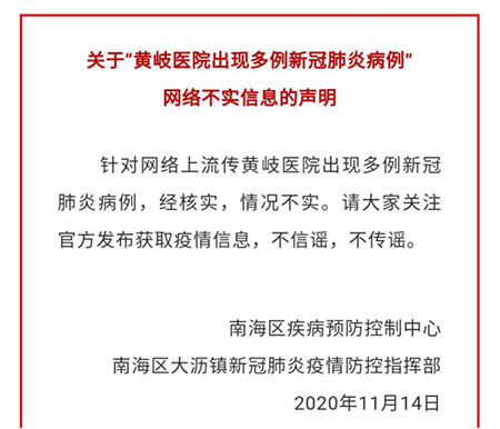 【真相】11月14日,南海区卫生健康局官方平台健康南海微信公众号发布声明,经过官方核实,“黄岐医院出现多例新冠肺炎病例”的信息不实,系谣言。
