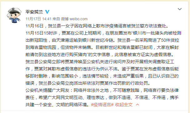 【真相】11月17日平安贺兰发布通知证实此消息为谣言,内容为贾某捏造,贾某对其散布虚假信息的违法行为供认不讳。