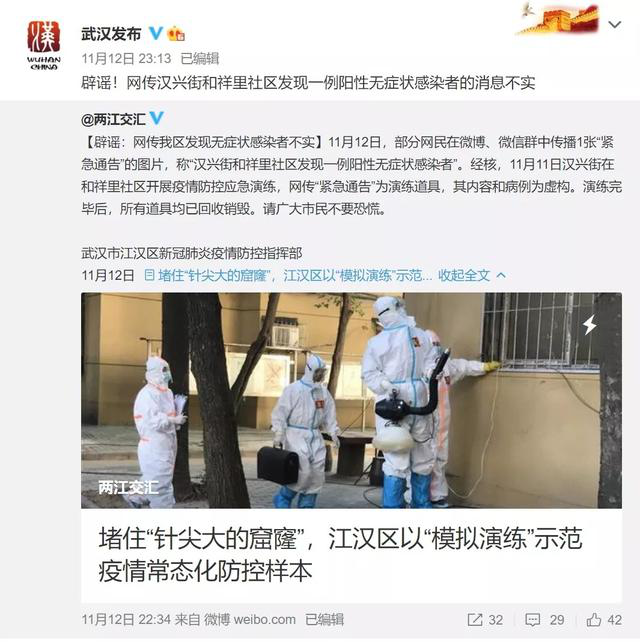 【事件】11月12日,部分网民通过微博、微信群平台传播1张“紧急通告”的图片,称“武汉江汉区汉兴街和祥里社区发现一例阳性无症状感染者”。