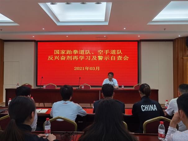 3月27日,国家跆拳道队、国家空手道队反兴奋剂再学习及警示自查会在海南五指山训练基地举行。中国跆协、中国空协主席管健民出席会议,国家队全体教练员、运动员、工作人员参加会议。