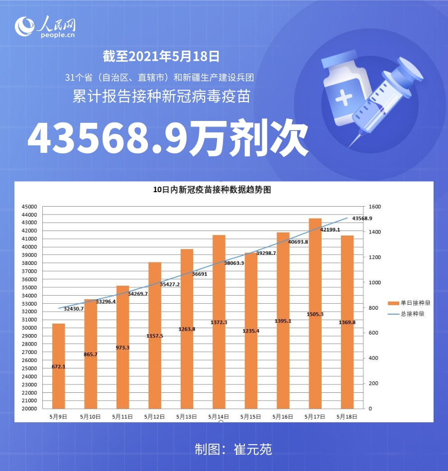 人民网北京5月19日电 (记者崔元苑)据国家卫生健康委官网消息,截至2021年5月18日,31个省(自治区、直辖市)及新疆生产建设兵团累计报告接种新冠病毒疫苗43568.9万剂次。18日单日接种新冠病毒疫苗1369.8万剂次。