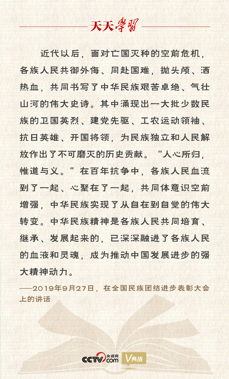 我们伟大的祖国是统一的多民族国家。各族群众头顶同一片天空,脚踏同一方土地,共同开发了祖国的锦绣河山,共同书写了我们悠久的历史,共同创造了我们灿烂的文化,共同培育了我们伟大的民族精神。一部中国史,就是一部各民族交融汇聚成多元一体中华民族的历史,就是各民族共同缔造、发展、巩固统一的伟大祖国的历史。