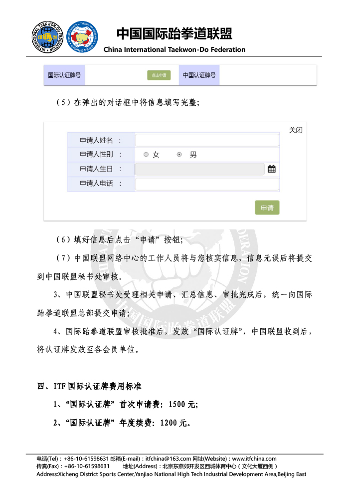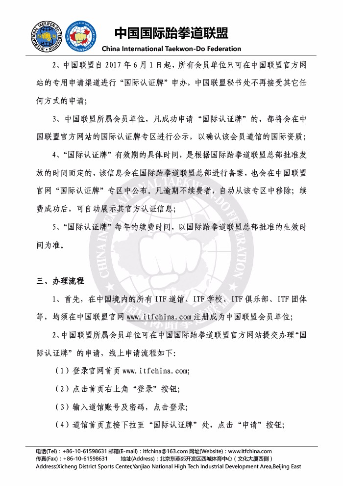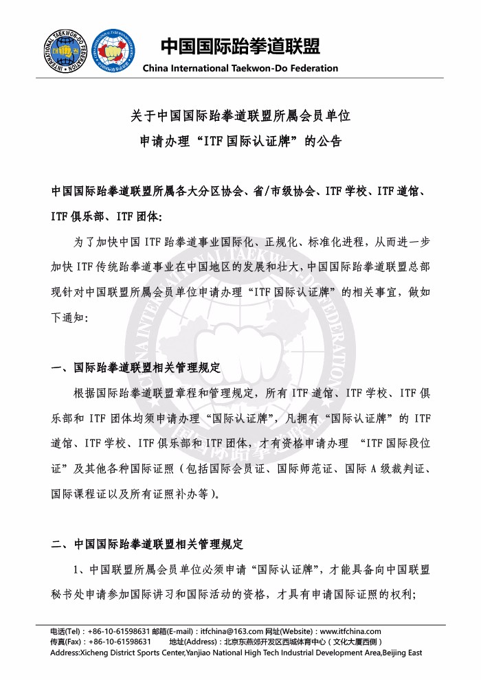 关于中国国际跆拳道联盟所属会员单位申请办理“ITF国际认证牌”的公告