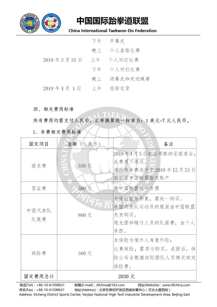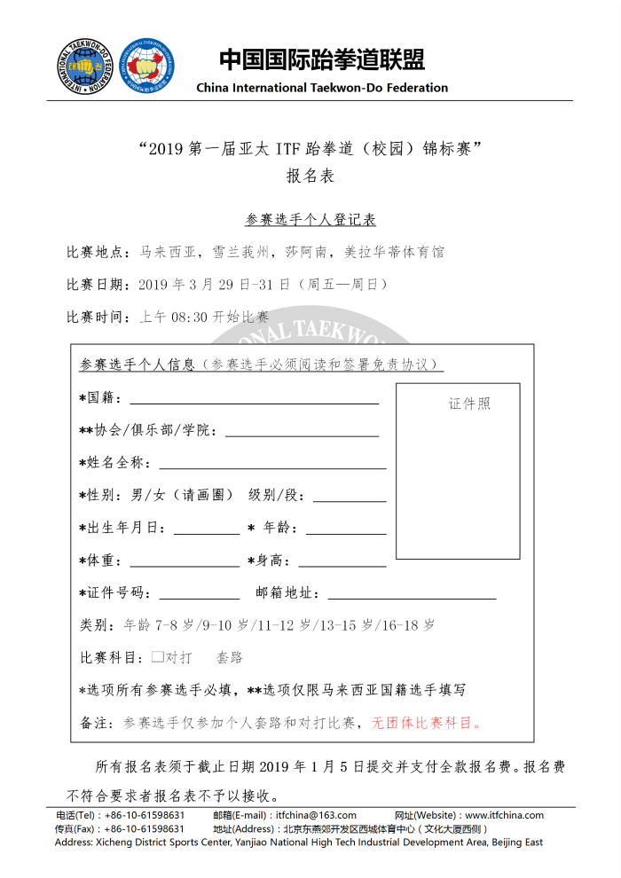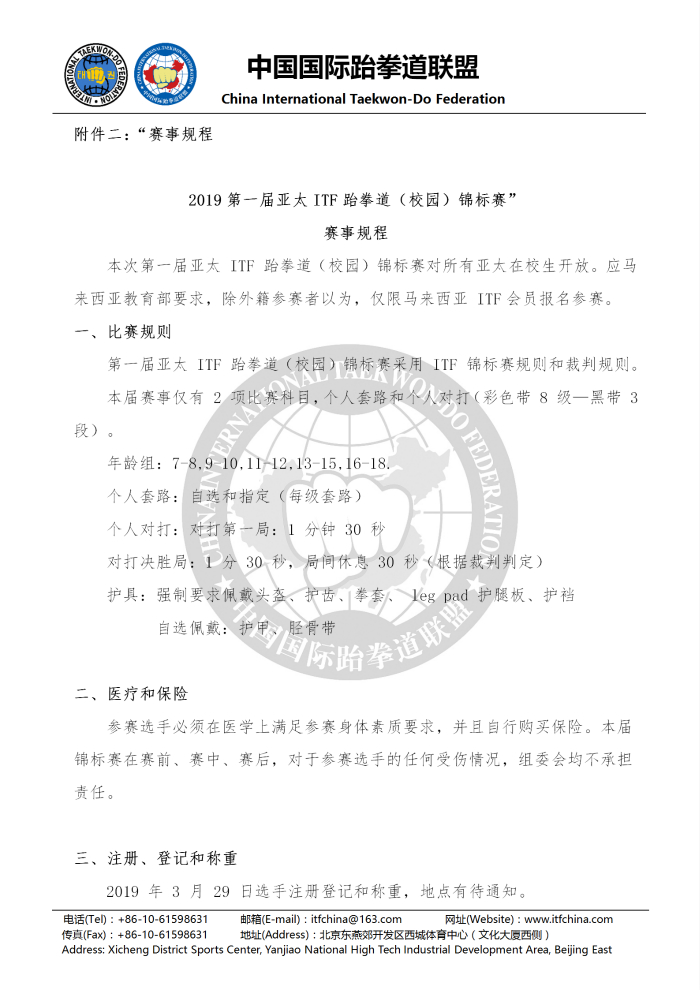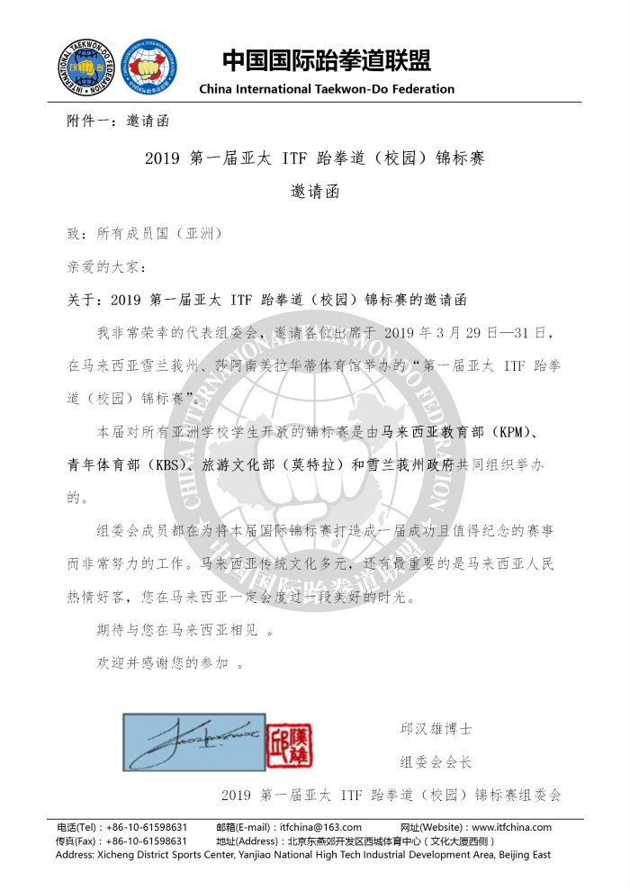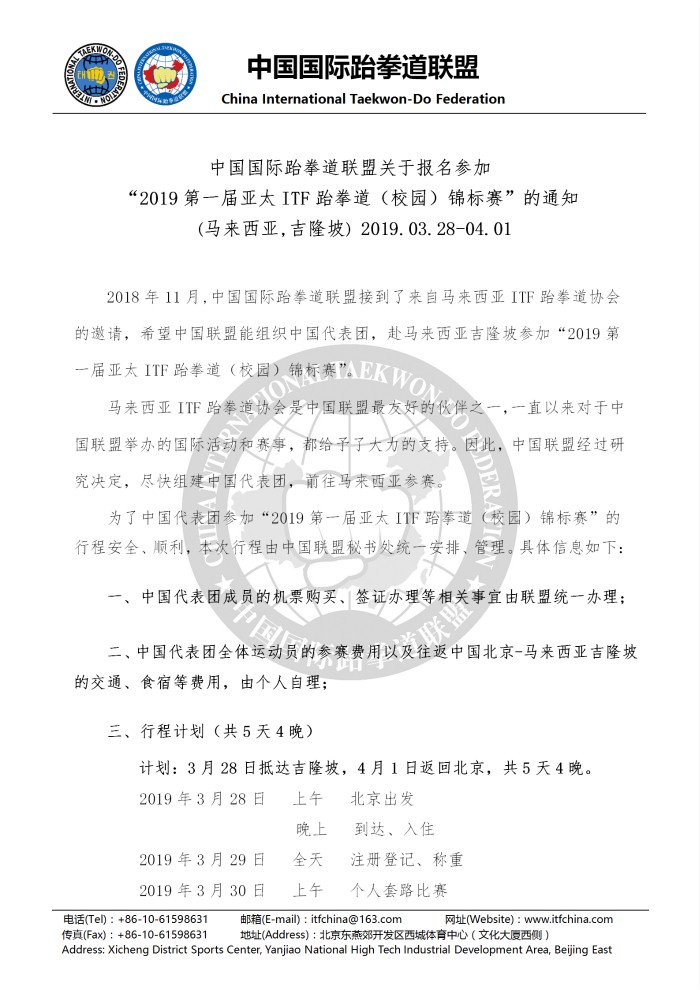 中国国际跆拳道联盟关于报名参加 “2019第一届亚太ITF跆拳道(校园)锦标赛”的通知